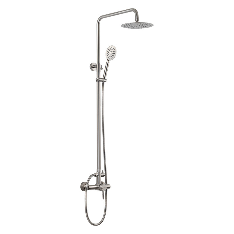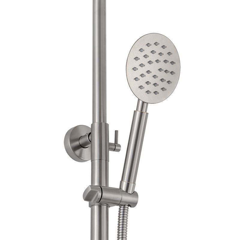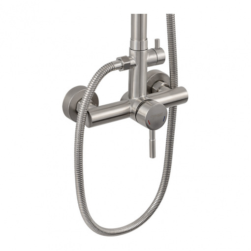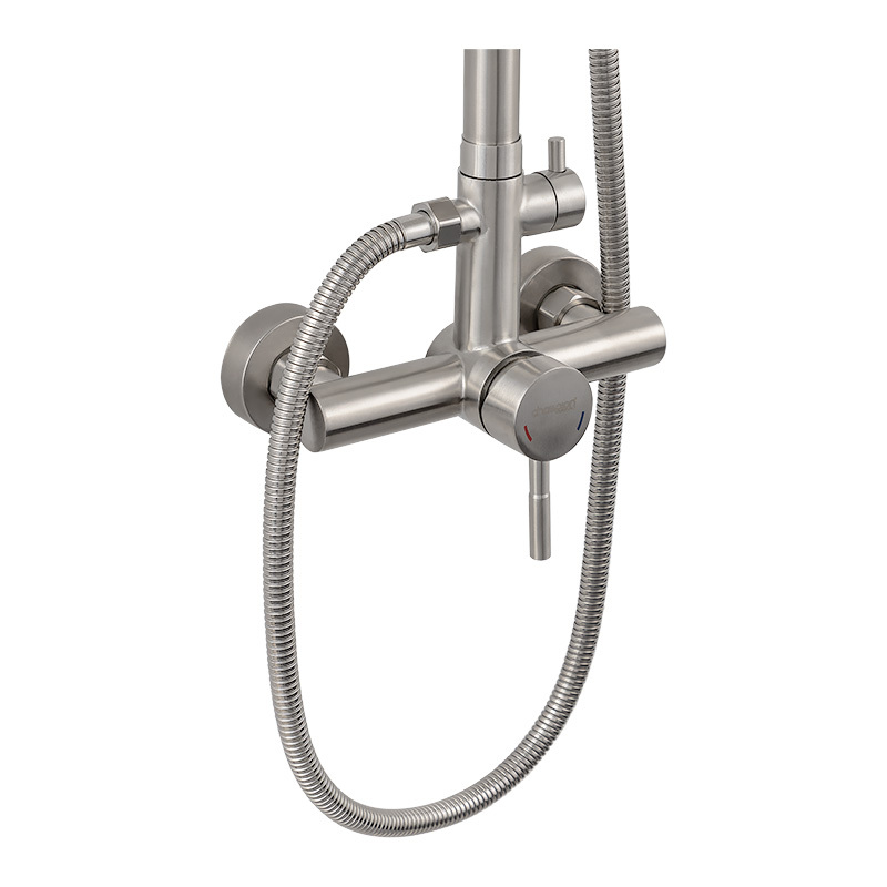 Душевая колонна со смесителем CHAMPION SUS-003-J из нерж. стали SUS304 (CH0325) имеет заменяемый запорный элемент - керамический картридж диаметром 35 мм. Устанавливается на трубы холодной и горячей воды, вмонтированные в стену. Комплектация включает шланг, ручную лейку, душевую стойку, кронштейн и крепежи.