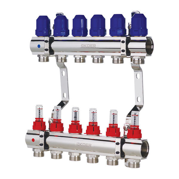 Коллекторный блок со встроенными расходомерами KOER KR.1110-06 1”x6 WAYS (KR2643) выпускается для распределения теплоносителя к потребителям в системах водяного отопления – радиаторам, конвекторам, петлям теплого пола, обогрева открытых площадок.