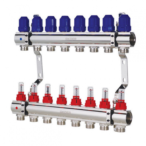 Коллекторный блок со встроенными расходомерами KOER KR.1110-08 1”x8 WAYS (KR2645) выпускается для распределения теплоносителя к потребителям в системах водяного отопления – радиаторам, конвекторам, петлям теплого пола, обогрева открытых площадок.