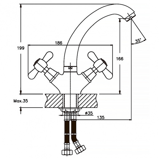 Излив литой длиной 135 мм. В качестве запорного элемента используются кран буксы с керамическими пластинами (180°) - 1/2. Высота смесителя - 199 мм. Подключается к трубопроводу двумя гибкими подводками, которые идут в комплекте вместе с крепежным элементом, аэратором и резиновыми прокладками. Поставляется в фирменной коробке Haiba.
