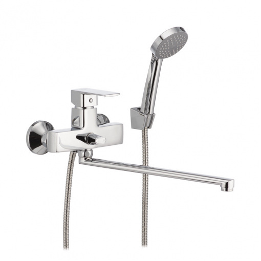 Смеситель для ванной с поворотным изливом Cron Kubus 006 Euro имеет заменяемый запорный элемент - картридж с керамическимим пластинами диаметром 35 мм. Устанавливается на трубы холодной и горячей воды, вмонтированные в стену. В комплектацию входит шланг 150 см, лейка, чашки, эксцентрики, резиновые прокладки, настенный держатель для лейки.