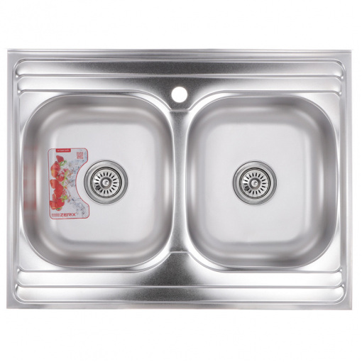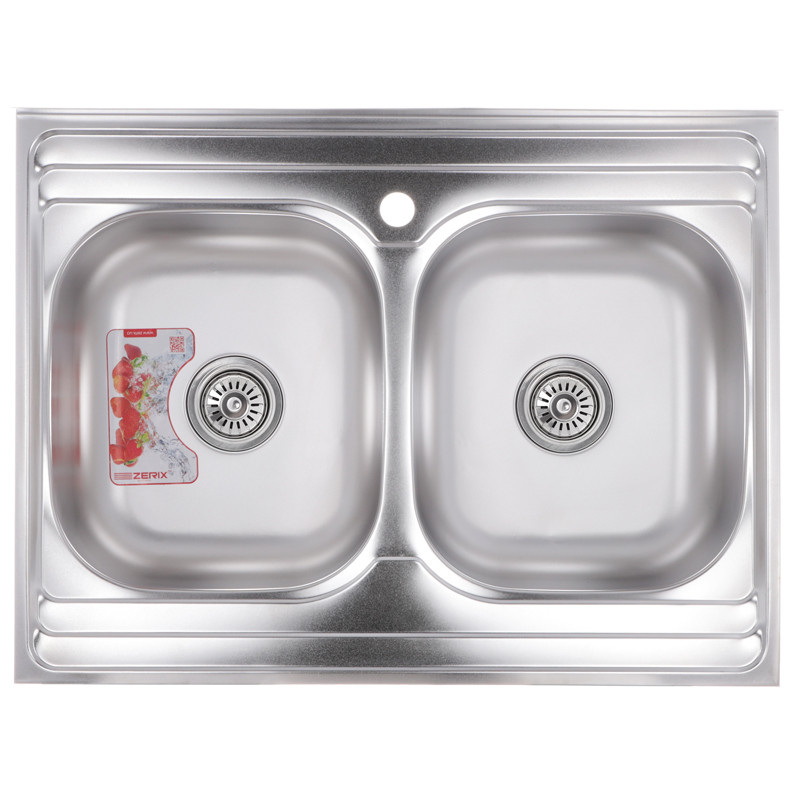Прямокутна накладна мийка для кухні Zerix виготовлена ​​з міцної нержавіючої сталі і має матову поверхню (satin). Завдяки двом чашам мити велику кількість продуктів або габаритний посуд набагато зручніше. Колір - сталевий. Розміри - 80х60 см, глибина - 18 см.