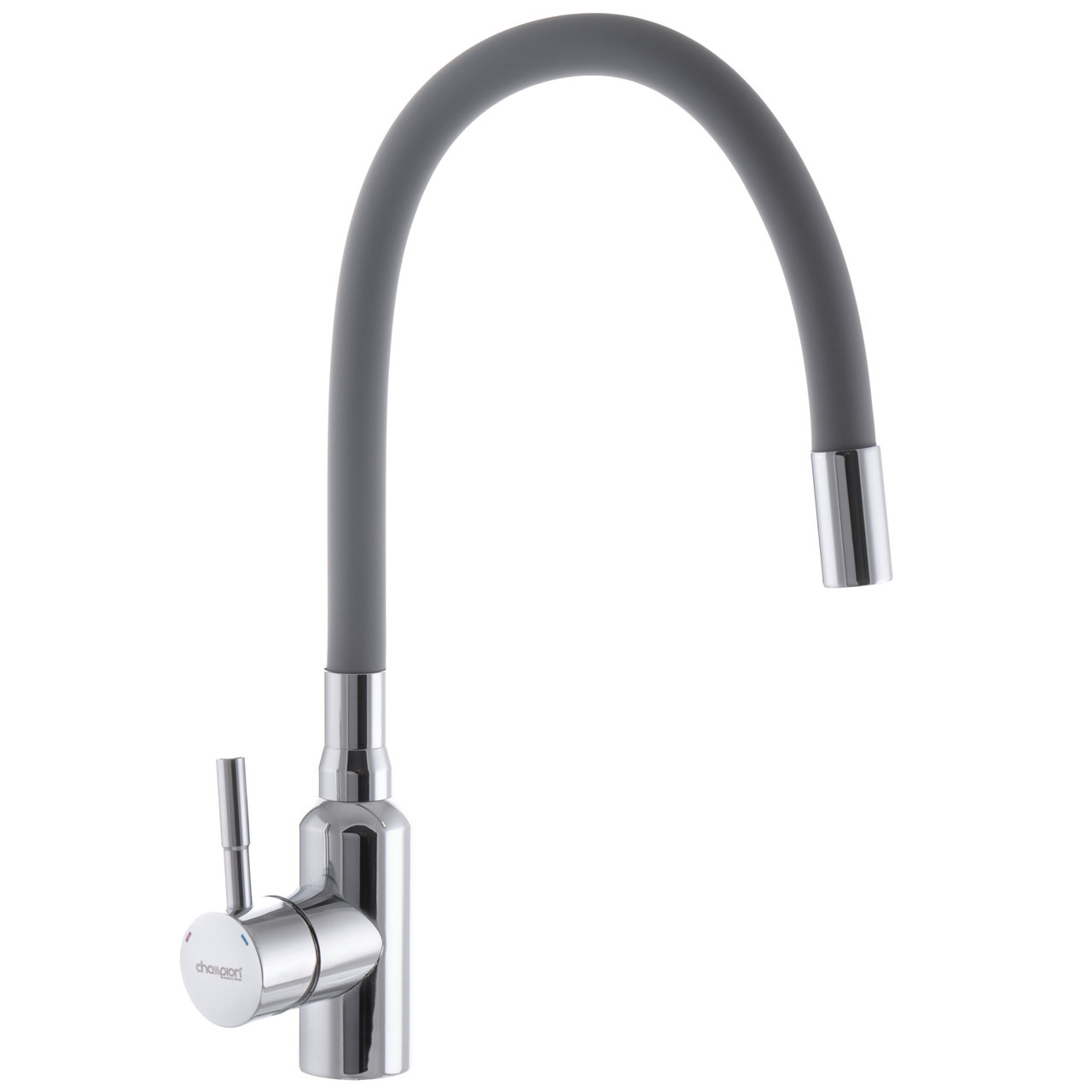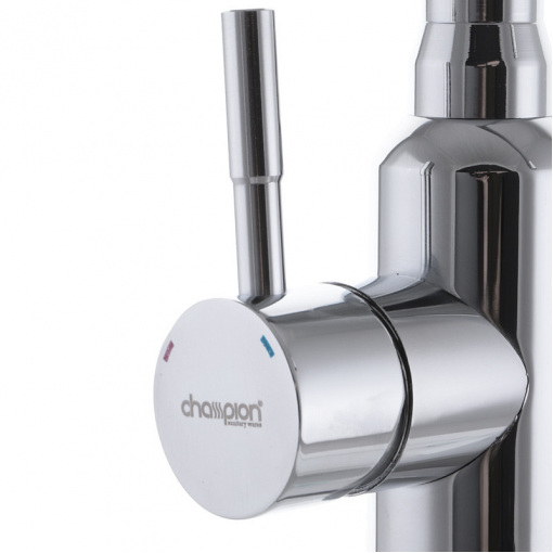 Особливість змішувача - сірий гнучкий силіконовий вилив. Запірний елемент - керамічний картридж, що замінюється. Підключається до трубопроводу двома гнучкими підводками, які йдуть у комплекті разом із кріпильним елементом та гумовими прокладками. Поставляється у фірмовій коробці CHAMPION.