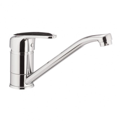 Одноручковий змішувач для кухні CRON MAGIC 004 (чорна ручка) (CR0105) монтується під один отвір (мийка, стільниця, підвіконня) на шпильку. Матеріал корпусу – стійкий до корозії силумін (сплав алюмінію з кремнієм). Покриття - дзеркальний хром. Особливість дизайну цього змішувача – чорна ручка – виділяє його з маси інших моделей. Запірний елемент – керамічний картридж діаметром 40 мм. Підключається до трубопроводу двома гнучкими підводками, які йдуть у комплекті разом із кріпильним елементом та гумовими прокладками. Поставляється у фірмовій коробці Cron.
