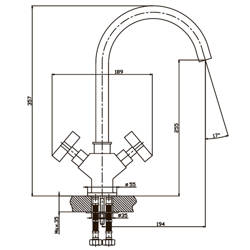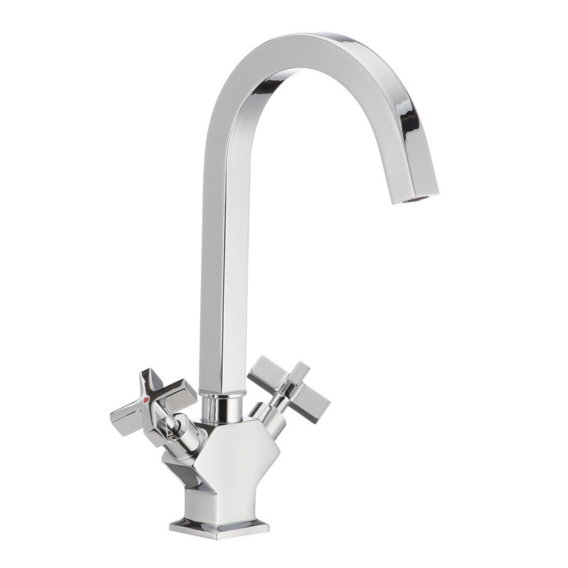 Дворучковий змішувач для кухні Haiba BERGUS 011 (HB0024) монтується під один отвір (мийка, стільниця, підвіконня) на шпильку. Виготовлений з латуні (сплаву цинку, міді та ін. металів), що володіє високою міцністю, зносостійкістю і є одним з кращих матеріалів для змішувачів. Покриття – хром, що захищає від корозії. Колір сталевий. Довжина поворотного виливу - 194 мм. Як запірний елемент використовуються кран букси з керамічними пластинами (180°) - 1/2." Підключається до трубопроводу двома гнучкими підводками, які йдуть у комплекті разом з кріпильним елементом, аератором та гумовими прокладками. Поставляється у фірмовій коробці Haiba.