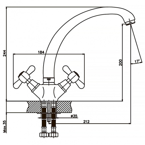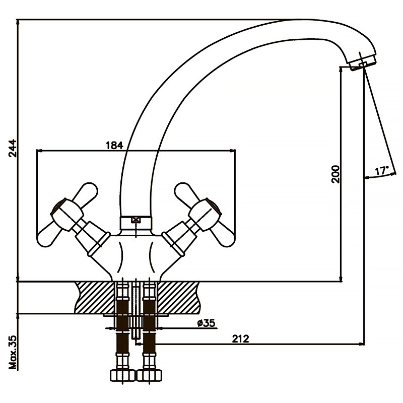 Дворучковий змішувач для кухні Haiba DOMINOX 273 (HB0084) монтується під один отвір (мийка, стільниця, підвіконня) на шпильку. Виготовлений з латуні (сплаву цинку, міді та ін. металів), що володіє високою міцністю, зносостійкістю і є одним з кращих матеріалів для змішувачів. Покриття – хром, що захищає від корозії. Колір сталевий. Довжина поворотного виливу - 212 мм. Як запірний елемент використовуються кран букси з керамічними пластинами (180°) - 1/2." Підключається до трубопроводу двома гнучкими підводками, які йдуть у комплекті разом з кріпильним елементом, аератором та гумовими прокладками. Поставляється у фірмовій коробці Haiba.