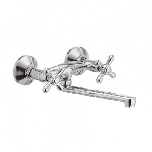 Дворучковий змішувач для кухні Haiba DOMINOX 361 (HB0094) монтується на стіну за допомогою ексцентриків, які йдуть в комплекті, разом з гумовими прокладками, аератором та декоративними чашками. Виготовлений з латуні (сплаву цинку, міді та ін. металів), що володіє високою міцністю, зносостійкістю і є одним з кращих матеріалів для змішувачів. Покриття – хром, що захищає від корозії. Колір сталевий. Довжина поворотного виливу - 20 см. Як запірний елемент використовуються кран букси з керамічними пластинами (180°) - 1/2. Поставляється у фірмовій коробці Haiba.