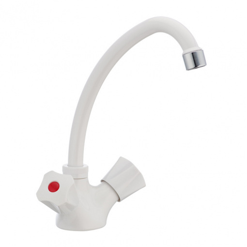 Дворучковий змішувач для кухні PLAMIX Omega-271 білий (PM0020) виготовлений з термопластику і має поруч переваг: не схильний до впливу корозії, має стійкість до солі, лугу і кислот, в процесі експлуатації не темніє, не змінює колір і легко чиститься. Під час виробництва використовуються екологічно чисті матеріали. Змішувач складається із стандартних деталей, які у разі чого можна замінити.