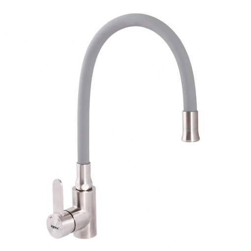 Особливість змішувача - сірий гнучкий силіконовий вилив. Запірний елемент – керамічний картридж 35 мм. Підключається до трубопроводу двома гнучкими підводками, які йдуть в комплекті разом з елементом кріплення, аератором і гумовими прокладками. Поставляється у фірмовій коробці Zerix.