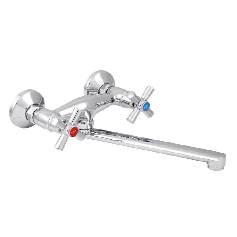 Дворучковий змішувач для кухні ZERIX TMK 722 (ZX0086) монтується на стіну за допомогою ексцентриків, які йдуть в комплекті, разом з гумовими прокладками та декоративними чашками. Матеріал корпусу – стійкий до корозії силумін (сплав алюмінію з кремнієм). Покриття - дзеркальний хром. Довжина поворотного виливу - 25 см. Запірний елемент - керамічна напівзворотна кран буксу (180 °). Постачається у фірмовій коробці Zerix.