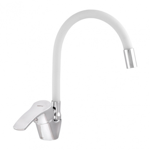 Особливість змішувача - білий гнучкий силіконовий вилив. Запірний елемент – керамічний картридж 40 мм. Підключається до трубопроводу двома гнучкими підводками, які йдуть в комплекті разом з елементом кріплення, аератором і гумовими прокладками. Поставляється у фірмовій коробці Zerix.