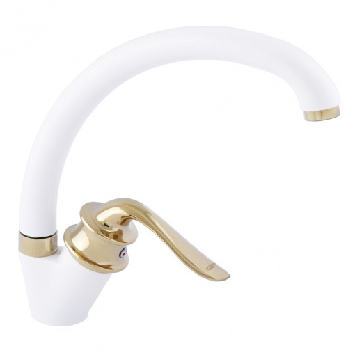 Одноручковий змішувач для кухні ZERIX Z59219-7 (ZX0496) монтується під один отвір: мийка, стільниця, підвіконня. Матеріал корпусу – стійкий до корозії силумін (сплав алюмінію з кремнієм). Покриття - біла та золота фарба.