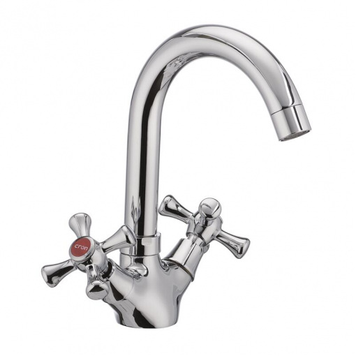 Дворучковий змішувач для умивальника CRON SMES 274 (CR0070) монтується гайкою на один отвір. Матеріал корпусу – стійкий до корозії силумін (сплав алюмінію з кремнієм). Покриття - дзеркальний хром. Довжина виливу 140 мм. Як запірний елемент використовуються кран букси з керамічними пластинами (180°) - 1/2. Підключається до трубопроводу двома гнучкими підводками, які йдуть в комплекті разом з елементом кріплення, аератором і гумовими прокладками. Поставляється у фірмовій коробці Cron.