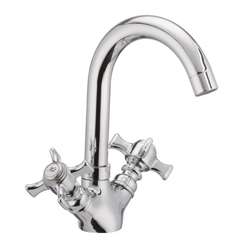 Дворучковий змішувач для умивальника CRON ZEUS 274 (CR0084) монтується гайкою на один отвір. Матеріал корпусу – стійкий до корозії силумін (сплав алюмінію з кремнієм). Покриття - дзеркальний хром. Довжина виливу 140 мм. Як запірний елемент використовуються кран букси з керамічними пластинами (180°) - 1/2. Підключається до трубопроводу двома гнучкими підводками, які йдуть в комплекті разом з елементом кріплення, аератором і гумовими прокладками. Поставляється у фірмовій коробці Cron.