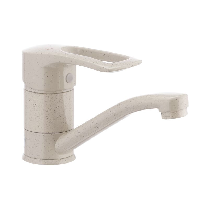 Одноручковий змішувач для умивальника Haiba HANSBERG 004 (вилив 15 см) бежевий (HB0187) монтується шпилькою на умивальник на один отвір. Корпус виконаний з сантехнічної латуні категорії А, покритий бежевою фарбою (MC) з чорними вкрапленнями під граніт. мм. виробництва компанії Sedal. Висота змішувача – 116 мм. Підключається до трубопроводу двома гнучкими підводками, які йдуть в комплекті разом з елементом кріплення, аератором і гумовими прокладками. Поставляється у фірмовій коробці Haiba.