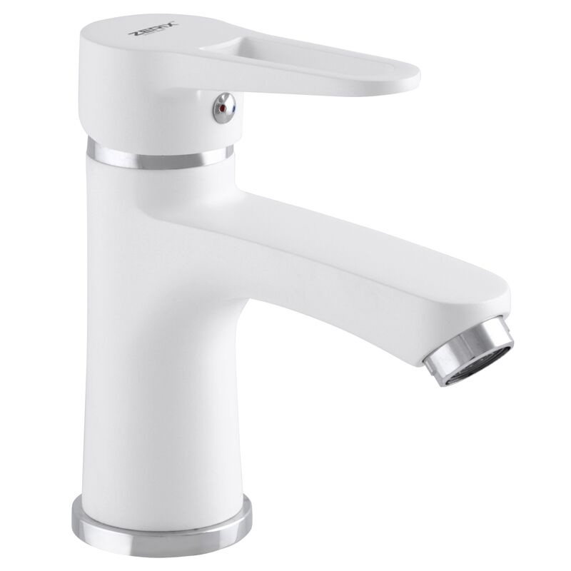 Одноручковий змішувач для умивальника ZERIX PUD1 046 білий (ZX2796) монтується гайкою на один отвір. Матеріал корпусу – стійкий до корозії силумін (сплав алюмінію з кремнієм). Покриття - біла фарба. Запірний елемент - керамічний картридж діаметром 35 мм. Підключається до трубопроводу двома гнучкими підводками, які йдуть в комплекті разом з елементом кріплення, аератором і гумовими прокладками. Поставляється у фірмовій коробці Zerix.