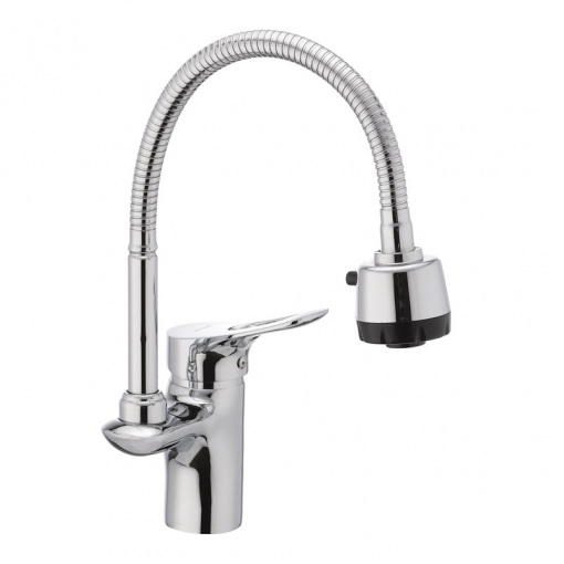 Одноручковий змішувач для кухні з рефлекторним виливом MIXXUS ARIZONA 014 (MI0589) монтується під один отвір (мийка, стільниця, підвіконня) на гайку. Матеріал корпусу змішувача для кухні на пружині – стійкий до корозії силумін (сплав алюмінію з кремнієм). Покриття - дзеркальний хром. Вилив гнучкий рефлекторний, з дворежимним аератором (струмінь і душ). Запірний елемент – керамічний картридж діаметром 40 мм. Підключається до трубопроводу двома гнучкими підводками, які йдуть у комплекті разом із кріпильним елементом та гумовими прокладками. Поставляється у фірмовій коробці Mixxus.