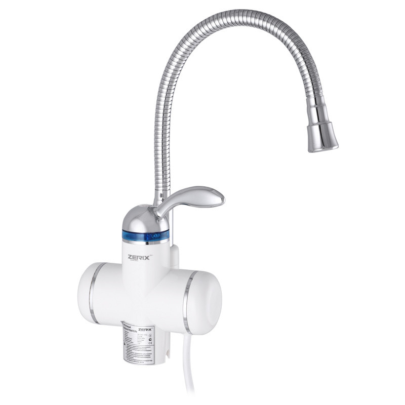Проточний змішувач ZERIX ELW01-F — це сучасний та безпечний водонагрівач проточної води. Пристрій мінімізує витрату води strong> і нагріває воду за лічені секунди. Так само він більш фінансово вигідний, ніж накопичувальний водонагрівач. води. Використовують кран для води з підігрівом ZERIX для побутових цілей у приміщеннях, де: немає центрального гарячого водопостачання; не доцільно використовувати накопичувальний водонагрівач ( бойлер);є часті перебої з гарячою водою.Зверніть увагу: кран водонагрівач Зерикс не можна використовувати в неопалюваних приміщеннях. Встановлюється проточний змішувач водонагрівач до магістралі холодного водопостачання. Так само категорично заборонено підключати кран до розетки, якщо він не заповнений водою (може згоріти тен).