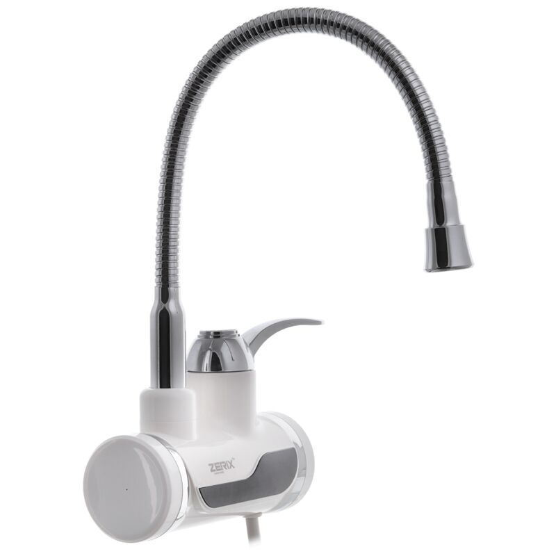 Проточний водонагрівач ZERIX ELW02-EFWP з індикатором температури та ПЗВ (ZX2806). Електричний проточний водонагрівач на кран Зерікс має низку переваг: зменшення витрати води, майже миттєве нагрівання, простий монтаж, невеликі витрати електроенергії. Проточний водонагрівачпрацює від мережі і рекомендований до покупки, якщо у вас відбуваються систематичні перебої з гарячою водою. Завдяки своїй потужності 3 kW водонагрівач ZERIX здатний нагріти воду до 60°С за менш ніж 5 сек. Суттєво економічніше Бойлер! Кран з підігрівом води дозволить Вам у будь-який час користуватися гарячою водою на кухні або ванній. Наявність індикатора температури дасть Вам можливість контролювати температуру нагрівання води. Так само кран оснащений захистом ПЗВ, яке відключить споживача від мережі живлення, якщо відбудеться витік струму. Вилив електричного крана водонагрівача обертається на 360 градусів, його дуже зручно використовувати як у звичайній раковині, так і в мийці з двома чашами.