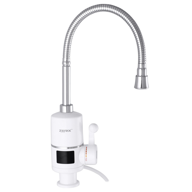 Проточний водонагрівач ZERIX ELW06-EF з індикатором температури (ZX3072). Електричний проточний водонагрівач на кран Зерікс має низку переваг: зменшення витрати води, майже миттєве нагрівання, простий монтаж, невеликі витрати електроенергії. Проточний водонагрівачпрацює від мережі і рекомендований до покупки, якщо у вас відбуваються систематичні перебої з гарячою водою. Водонагрівач ZERIX надзвичайно зручний у використанні завдяки своїм компактним розмірам. Кран із підігрівом води дасть можливість у будь-який час користуватися гарячою водою на кухні, ванній кімнаті або там, де є потреба в теплій воді. Гнучкий вилив дозволить вибирати висоту, напрямок струменя та кут струменя. Наявність індикатора температури надасть Вам можливість контролювати температуру нагрівання води.