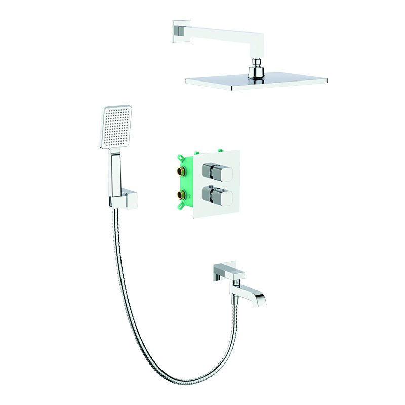 Комплектація термостат, лійка верхнього душу, шланг, лійка ручного душу, тримач лійки, вилив