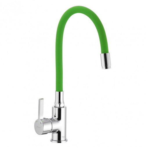 Одноручковий змішувач для кухні IBERGRIF M22112-5 з силіконовим виливом (кол. виливу зелений) з латуні (сплаву цинку, міді та ін. металів), що володіє високою міцністю, зносостійкістю і є одним з кращих матеріалів для змішувачів. Покриття – хром, що захищає від корозії. Колір сталевий. Кріпиться на один отвір (мийка, стільниця, підвіконня) на гайку.